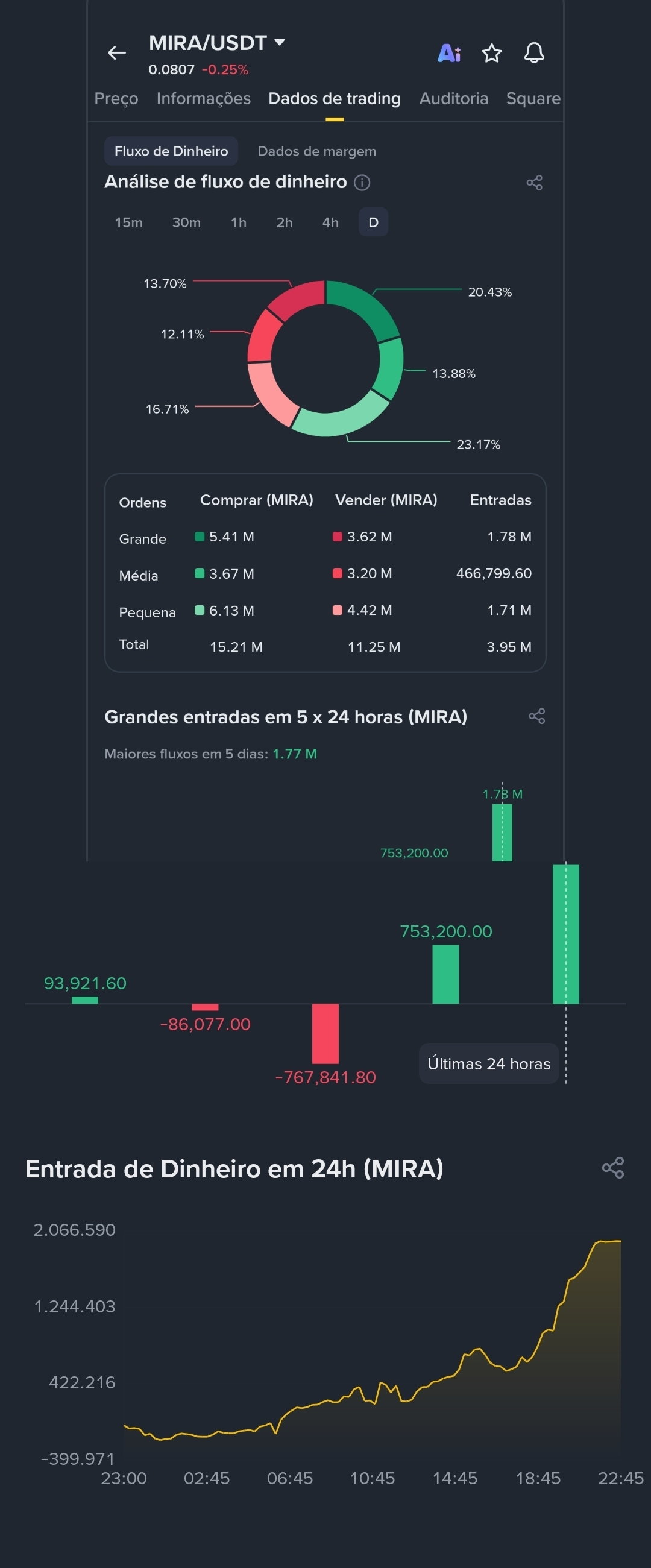 Primeiro, o painel de fluxo de dinheiro mostra que o volume de compras está maior que o de vendas. De acordo com os dados exibidos, o total de ordens de compra chega a aproximadamente 15.21 milhões de MIRA, enquanto as vendas somam cerca de 11.25 milhões. Isso sugere que, neste momento, existe mais gente acumulando o token do que se desfazendo dele.