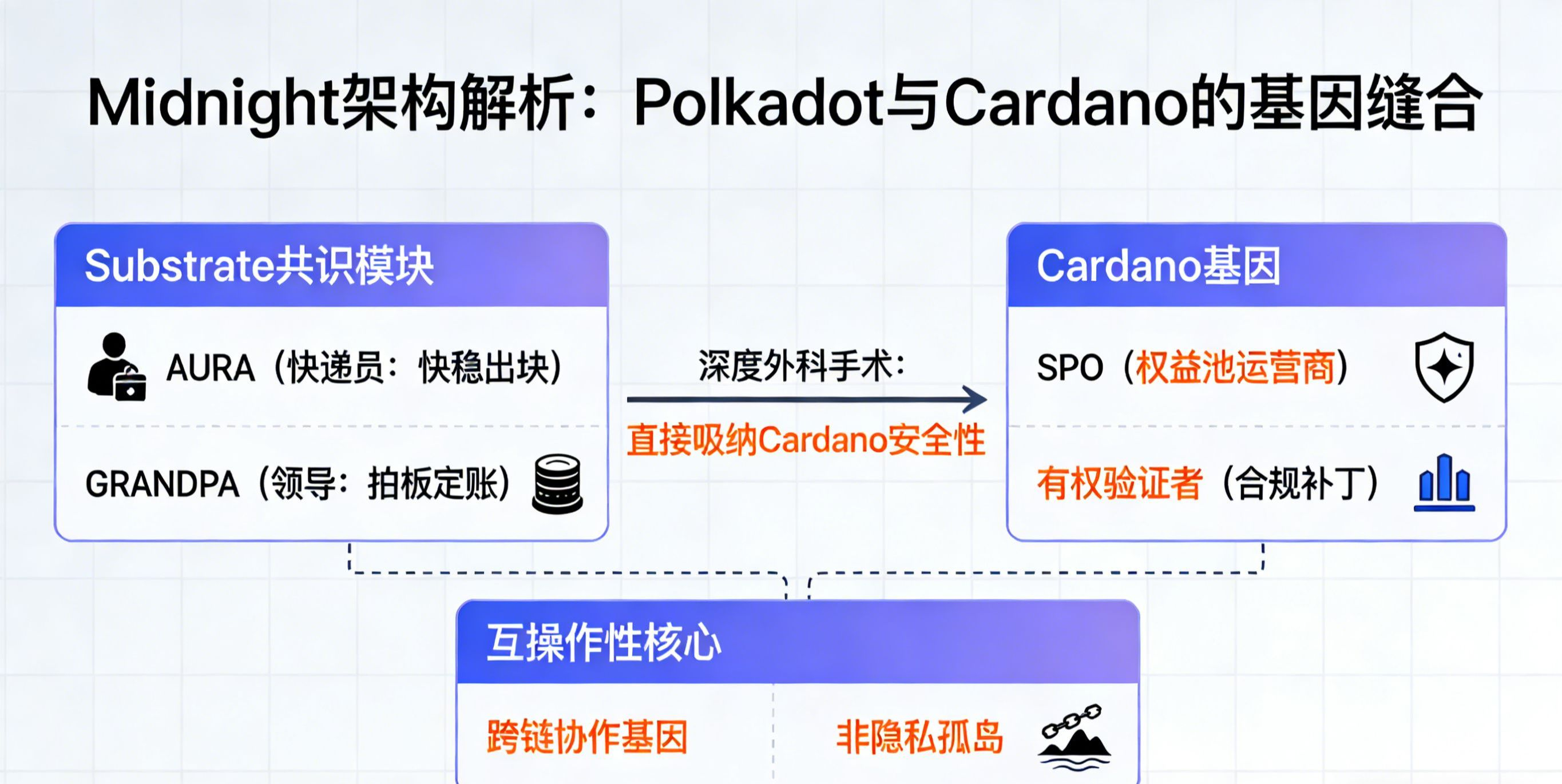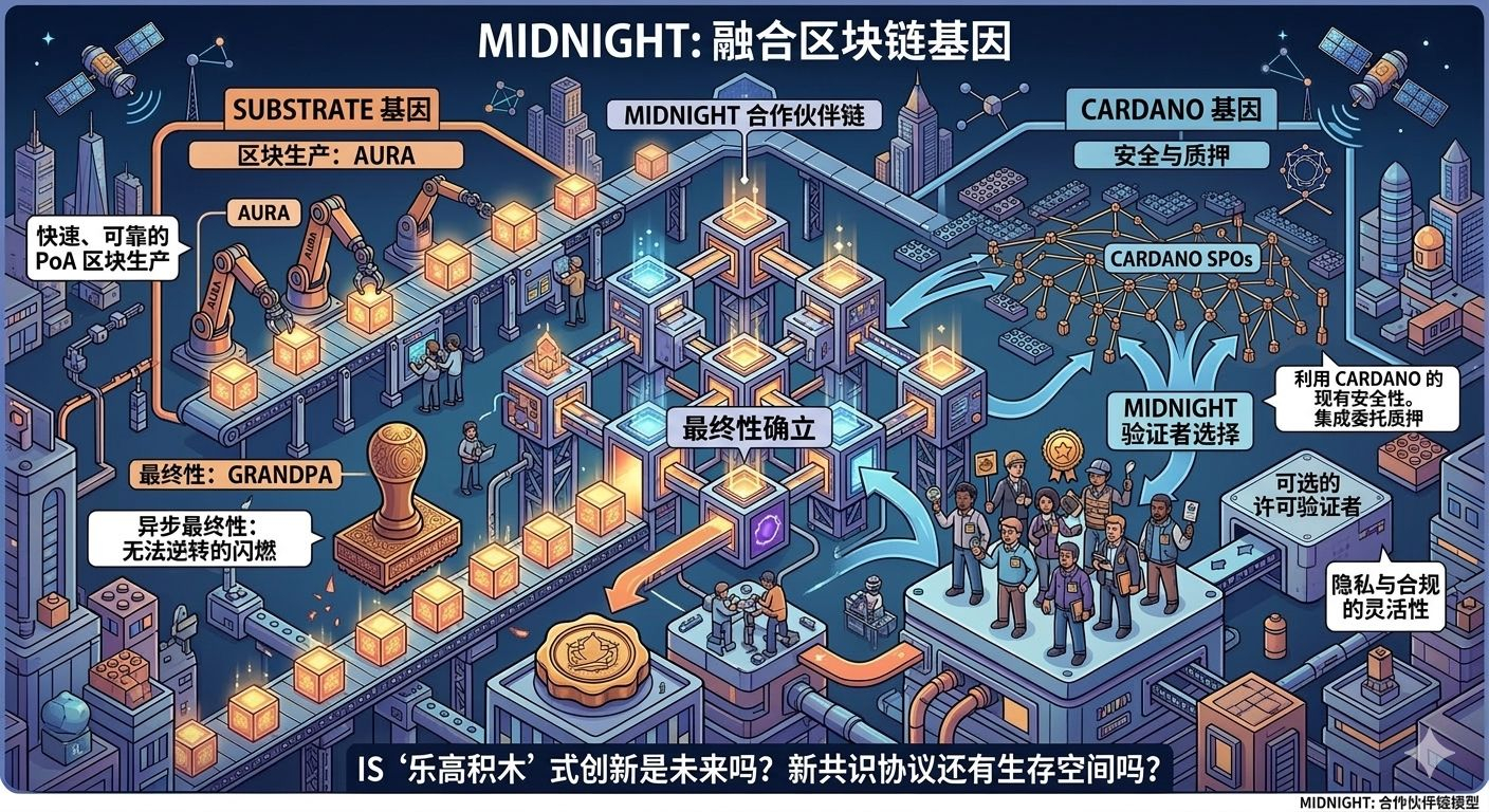 说白了,Midnight 就像是一个混血儿。它流着 Substrate 的血(用的 AURA 和 GRANDPA),但心又是属于 Cardano 的。