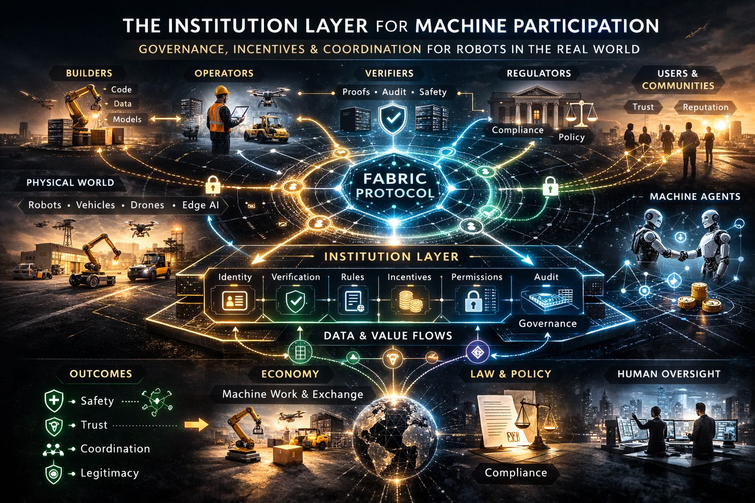 There’s another reason this matters, and I don’t think it gets enough attention. Governance isn’t just about restriction. It’s also about coordination. A functioning institution layer makes cooperation possible among actors who don’t fully know or trust each other. That’s huge for robotics. Builders need confidence that their contributions can be verified. Operators need confidence that machines can act within known limits. Users need confidence that systems can be audited. Regulators need confidence that oversight isn’t just symbolic. Communities need confidence that machine deployment won’t become a one-way imposition. Without those bridges, robotics stays fragmented. Impressive, maybe. Useful in pockets, sure. But structurally brittle.