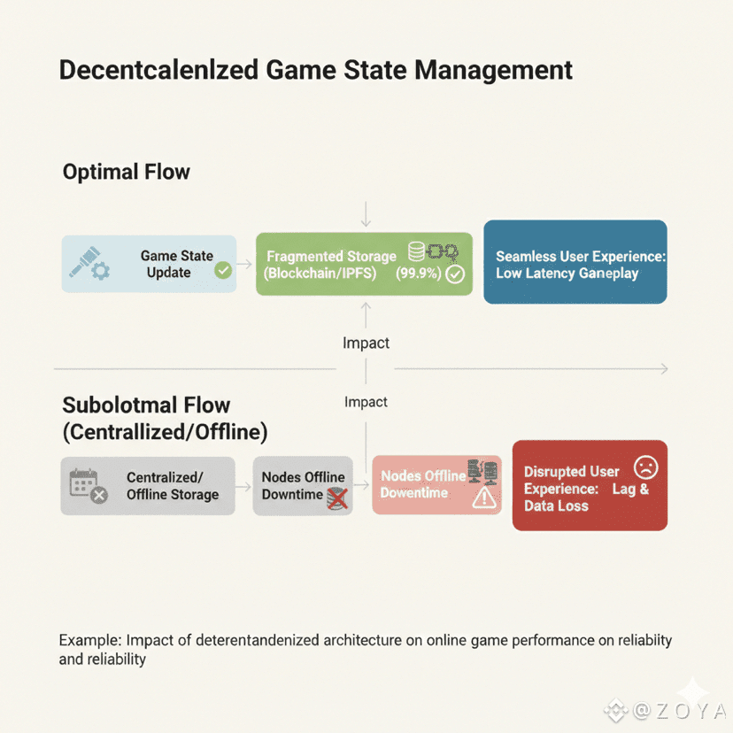 It’s the middle of a heated raid in a blockchain-based MMO. Players’ inventories, guild stats, chat logs—all flying across servers. Suddenly, three nodes drop offline. In most systems, inventories vanish, progress stalls, panic erupts. Not here. Walrus absorbs the shock. Erasure-coded fragments scattered across independent nodes rebuild the lost pieces in under 1.5 seconds, without developer intervention. Chat logs remain intact, leaderboard calculations continue, players barely blink.