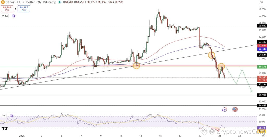 A typical scenario would involve a short-term bounce toward $89,800–$90,000, followed by consolidation or another test lower if sellers continue to defend that zone.