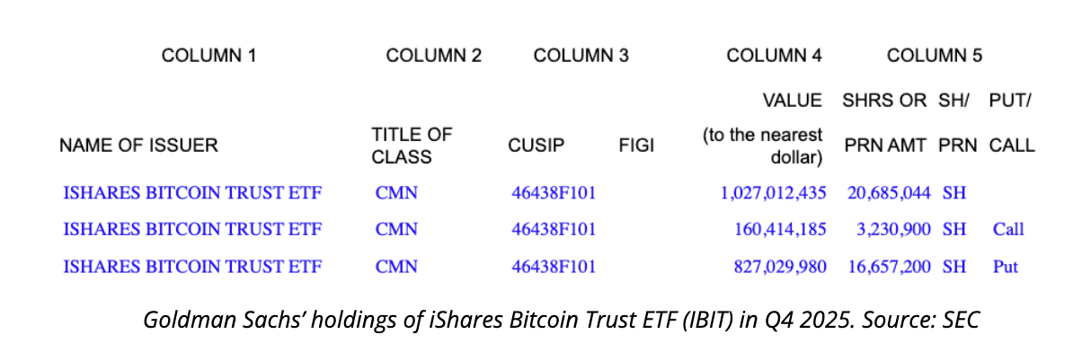 The bank cut its holdings in BlackRock’s iShares Bitcoin Trust (IBIT) by 39%, reducing shares outstanding from about 34 million in Q3 to 20.7 million in Q4, valued at roughly $1 billion. Goldman also trimmed positions in other Bitcoin-linked products, including Fidelity’s Wise Origin Bitcoin Fund (FBTC), Bitcoin Depot, and Ether ETFs.