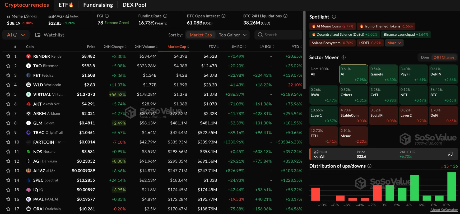 According to data from SoSoValue, despite a partial pullback in the overall crypto market, the AI and GameFi sectors continued to perform strongly, rising 7.98% and 6.30% respectively in the 24-hour period.