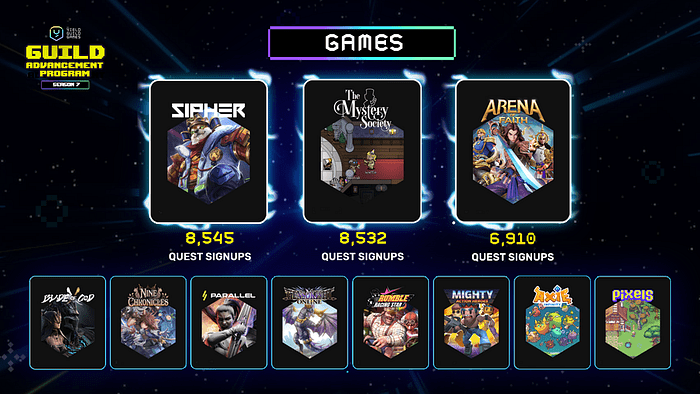Arena of Faith, Blade of God X, Mystery Society, and Sipher Odyssey made their debut in GAP, while Nine Chronicles, Parallel, Pixels, and Rumble Racing Star returned from Season 6. Classic early GAP games like Axie Infinity, GensoKishi Online, and Mighty Action Heroes also made a strong comeback.