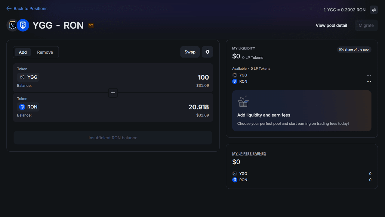 Verify your position: Visit the My Positions tab to see an overview of the YGG-RON liquidity pool and a breakdown of your potential earnings from the trading fees generated by the liquidity pool.