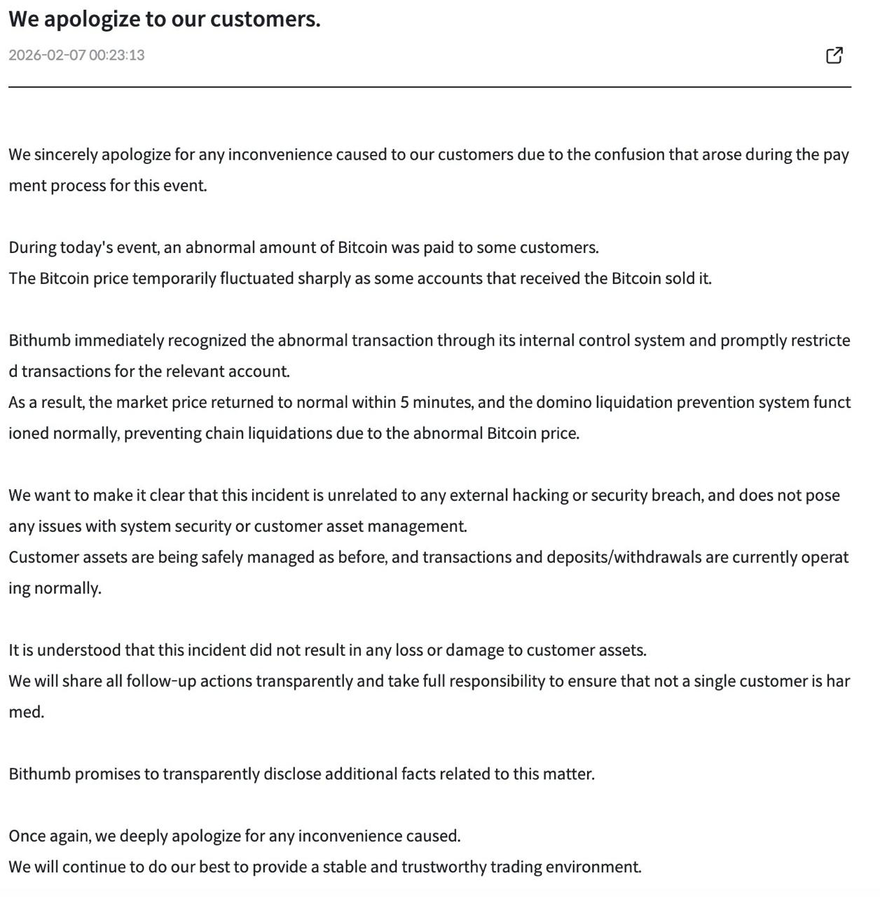 Bithumb publicly apologized and confirmed it would cover all losses caused by the incident. Users who sold during the glitch will receive full compensation plus an additional 10 percent bonus.