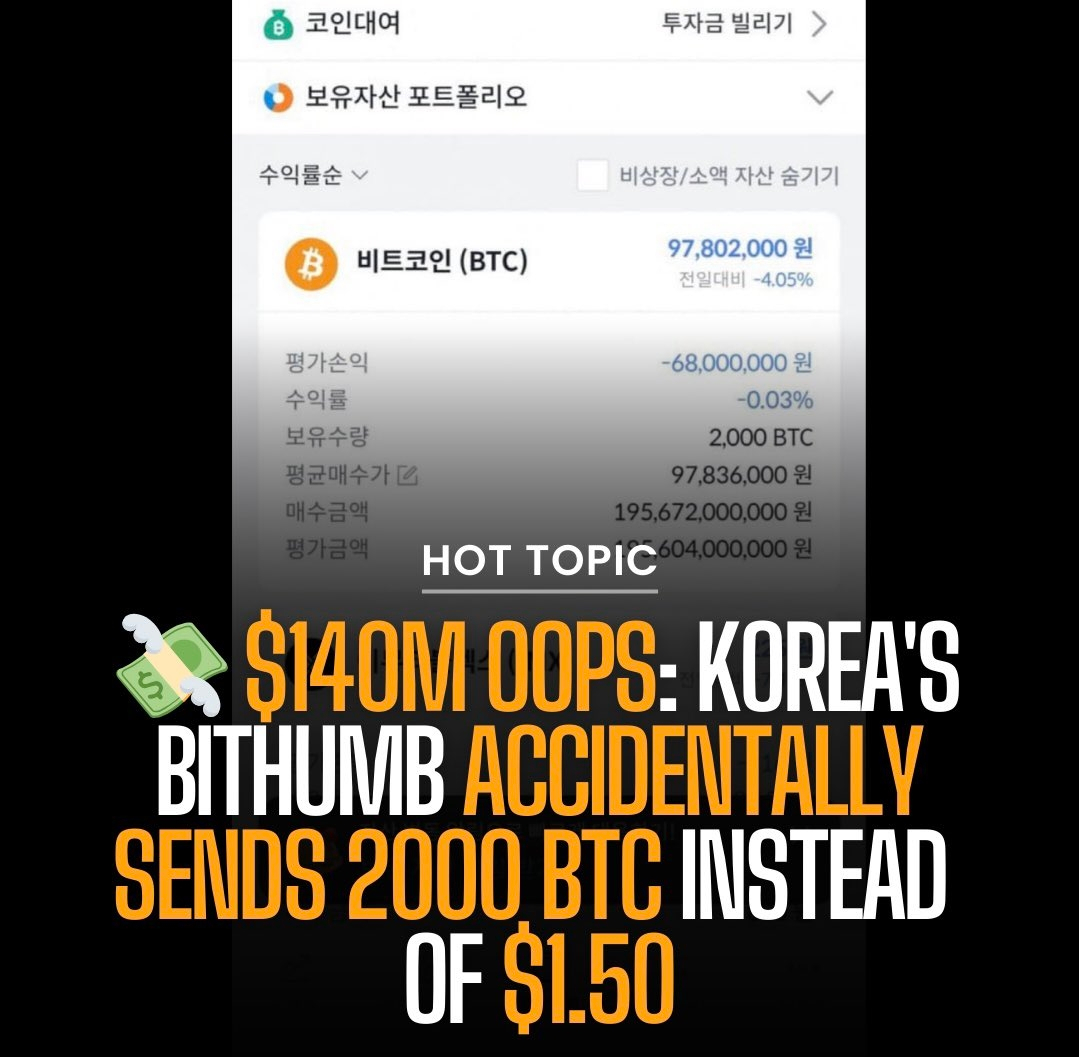 On February 6, Korean exchange Bithumb accidentally selected Bitcoin instead of Korean won while issuing a small compensation payout. The plan was simple: distribute around $1.40 worth of Korean won per user.