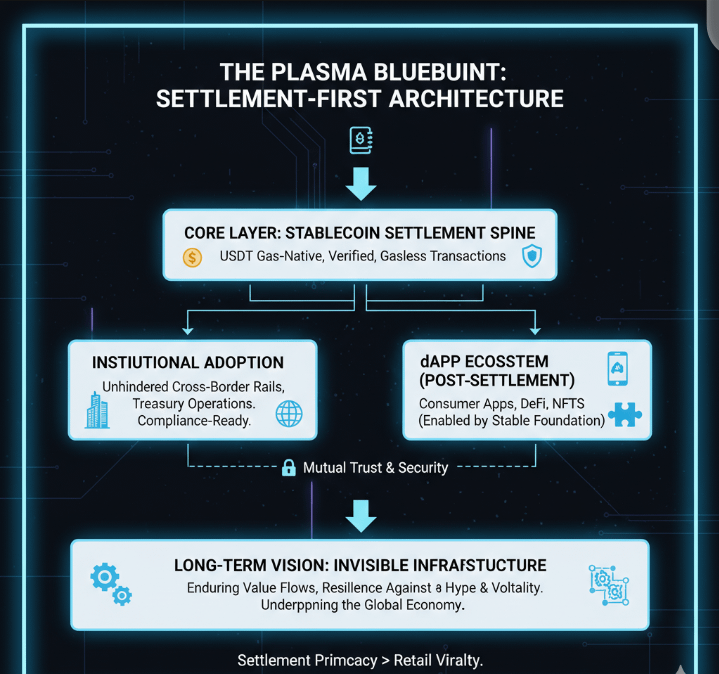 I've been digging into blockchain projects on Binance Square, not hunting for the next moonshot, but trying to understand why some designs quietly invert the usual playbook. One evening, thumbing through a thread on Plasma's launch, I paused on their core architecture diagram—the one labeling the "settlement layer" as the foundational spine, with stablecoin rails embedded right into the protocol from genesis. It wasn't a flashy UI mockup or a DeFi yield farm teaser; it was this deliberate blueprint showing how every transaction funnels back to a verified, gasless USDT settlement before anything else blooms on top. That screen, with its clean lines tracing value flows from edge to core, jolted me. In a space obsessed with instant liquidity and viral apps, why start here, with the backend drudgery? It forced me to confront something I'd glossed over: maybe the rush to user-facing bells and whistles is just crypto's way of papering over insecure foundations.