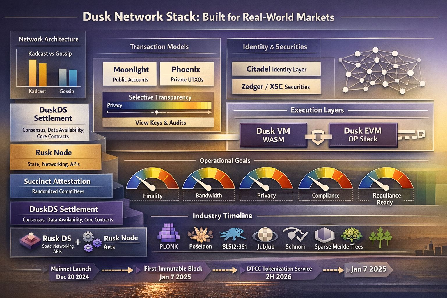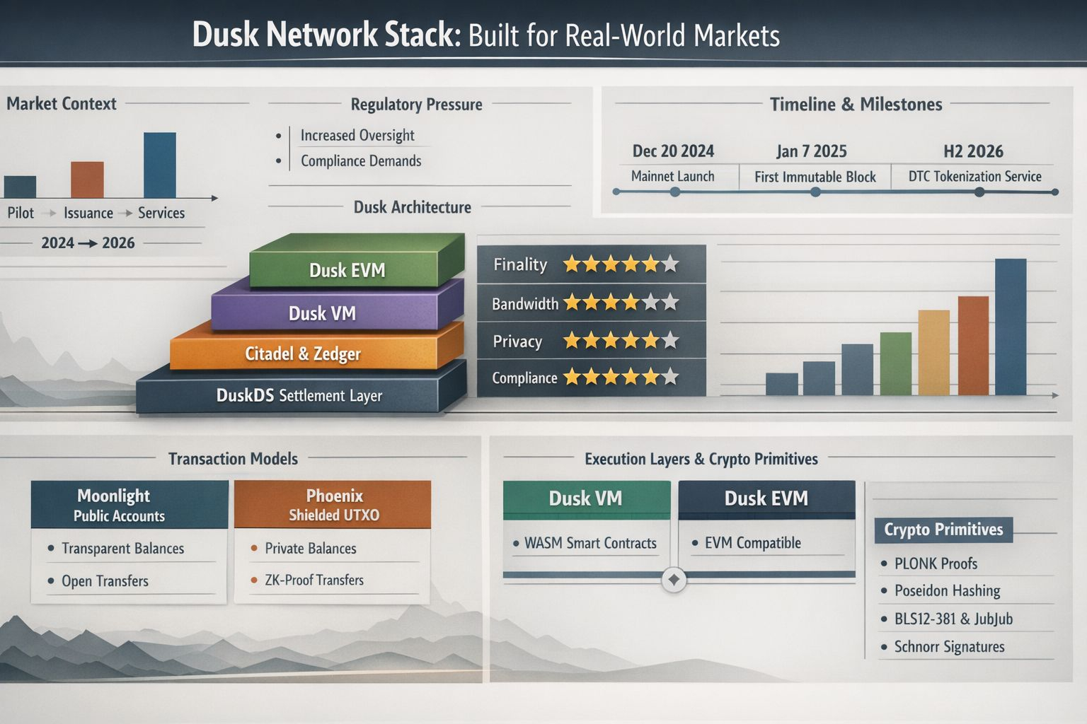 None of this works without the cryptography doing its job quietly. Dusk points to PLONK proofs, Poseidon hashing for proof circuits, and primitives like BLS12-381, JubJub, Schnorr signatures, and sparse Merkle trees. Fast verification is the whole point; otherwise privacy becomes a luxury feature. Dusk’s mainnet rollout began on December 20, 2024 and targeted its first immutable block on January 7, 2025.