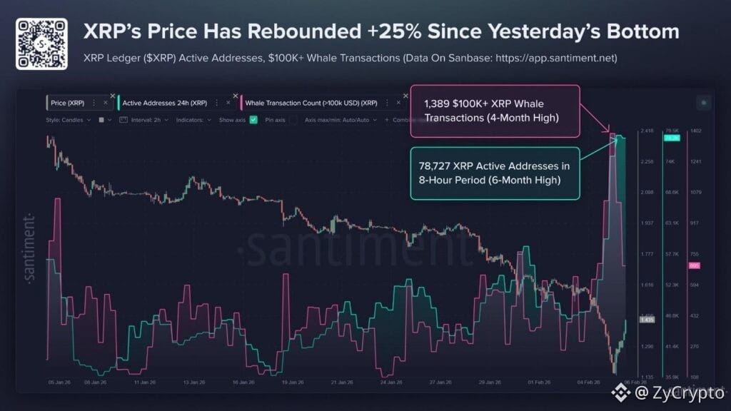 Popular on-chain analytics firm Santiment highlighted a notable surge in on-chain activity during the rebound. According to its data, the XRP Ledger recorded 1,389 whale transactions worth $100,000 or more, marking the highest level of large-holder activity in the past four months.