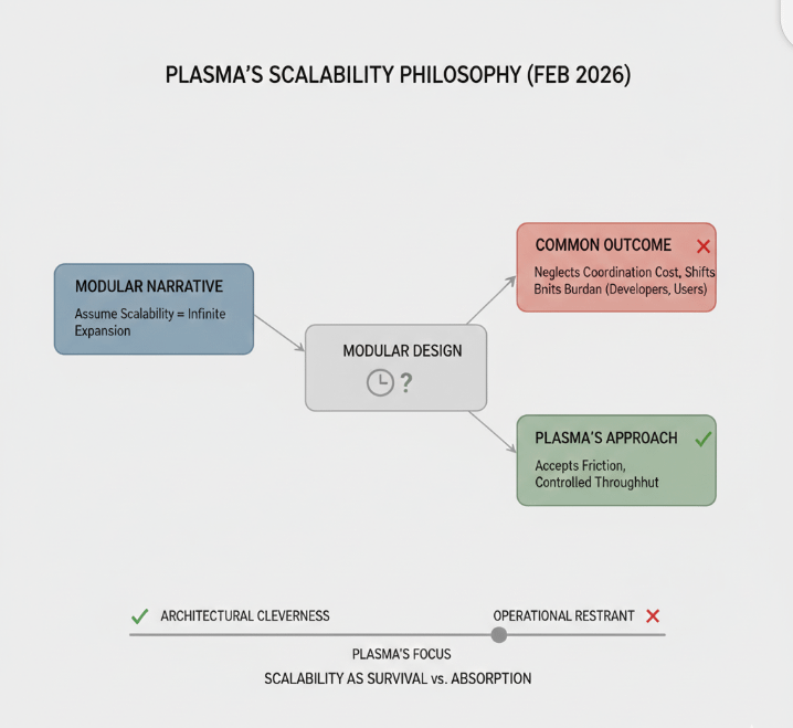 Outside this task I have absorbed the idea that modular equals flexible and flexible equals scalable. But flexibility has a social cost. Every interface becomes a negotiation. Every module adds another place where responsibility can blur. Plasma seems to lean into a different assumption. It treats scalability less like infinite expansion and more like controlled throughput. That sounds conservative and it is. It also feels more honest.