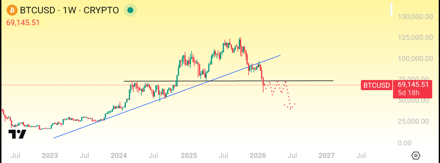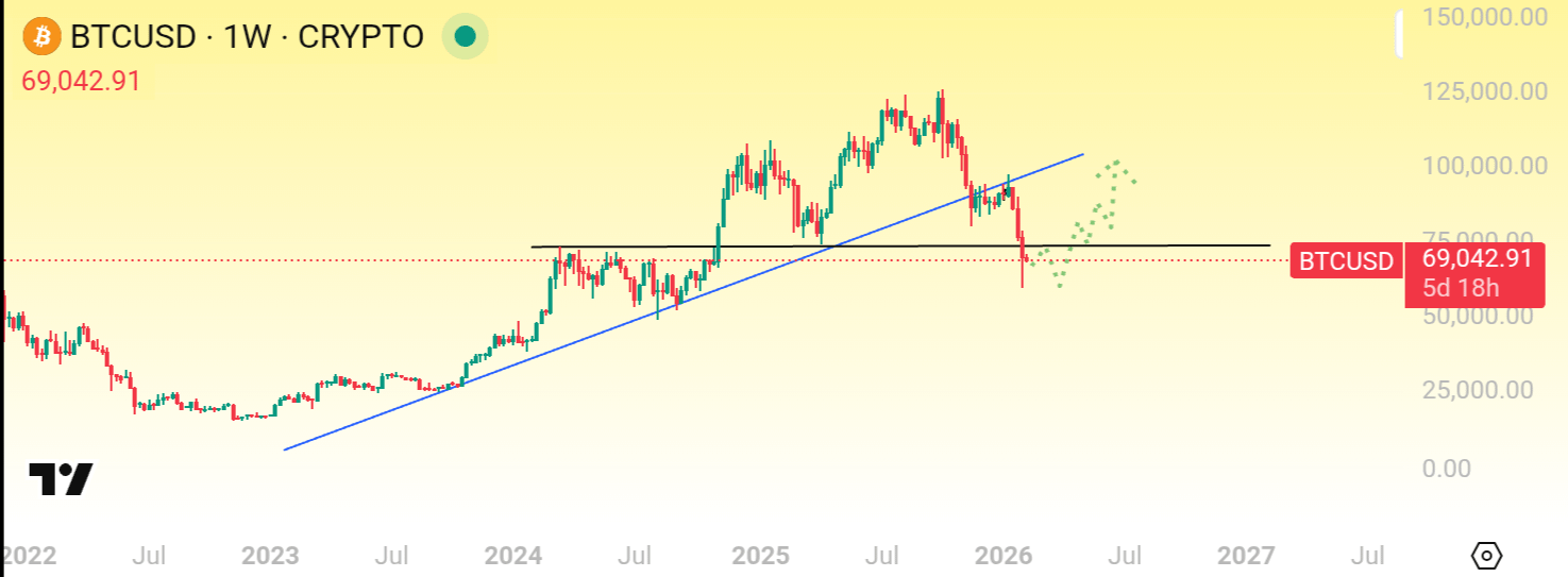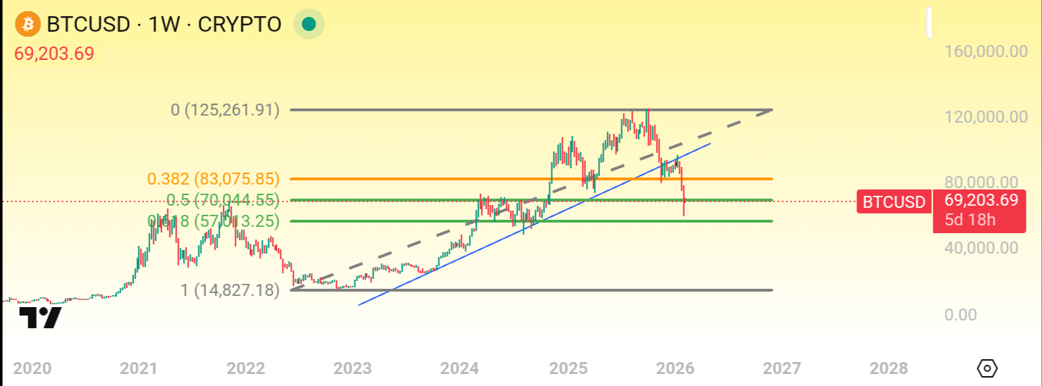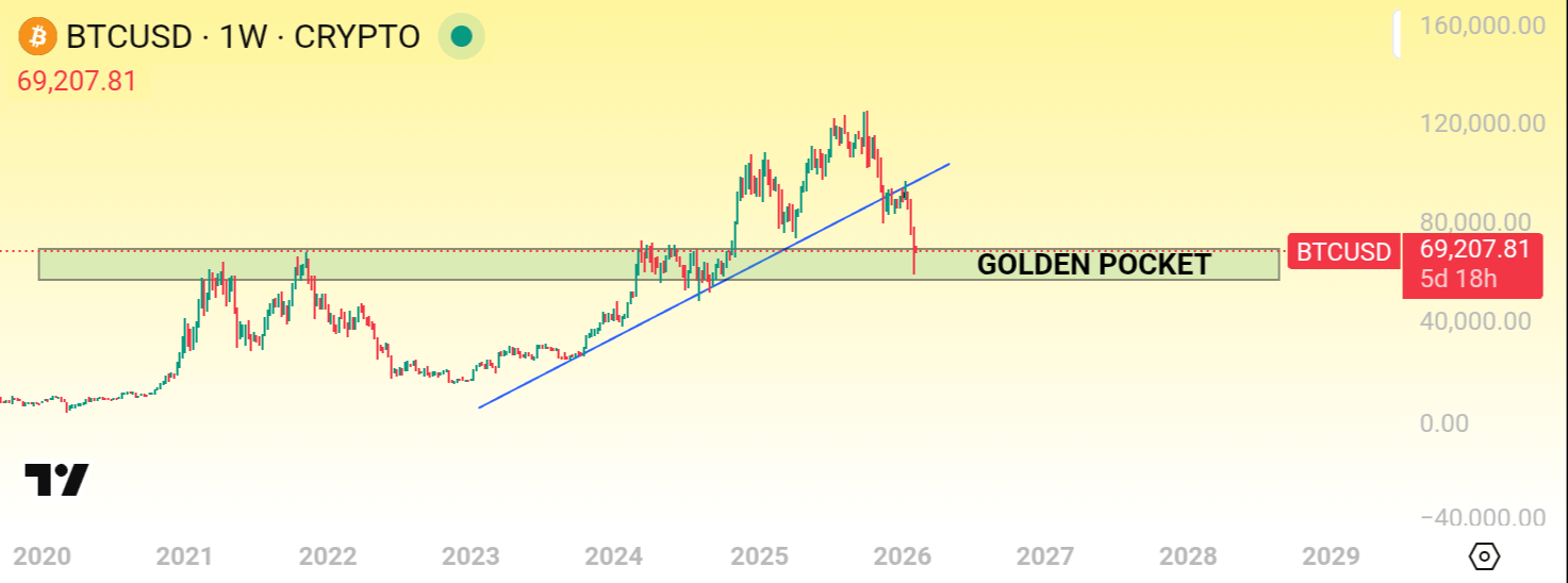 Measuring from the 2022 bear market bottom to the 2025 high, we have a Golden Pocket zone between $57,000 and $70,000, and Bitcoin is currently trading inside it.