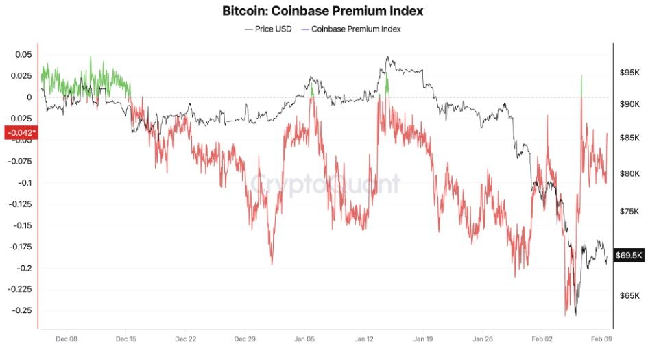 比特币(BTC)近期维持在7万美元左右震荡,随着市场逐步稳定,Coinbase溢价指数自1月中旬以来首次转正,显示出卖压逐步缓解,防御性市场的状态开始松动。随着BTC价格在接近7万美元时企稳,投资者的情绪逐渐恢复,市场对于比特币的未来走向重新燃起希望。