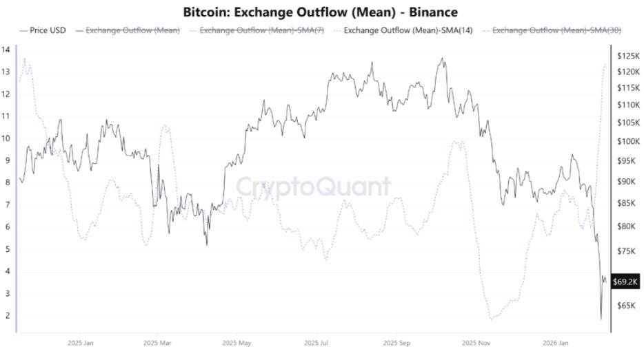 在市场情绪略显恐慌的背景下,巨鲸的买入行为引发了分析师的广泛关注。根据CryptoQuant的数据显示,当前市场正经历一个“恐慌中的吸筹”阶段。尽管市场情绪普遍偏向悲观,但均值交易所流出量的急剧上升表明,机构投资者和大户正在积极买入,并将比特币从交易所提取到自己的钱包中,这可能为比特币价格在当前区间提供支撑。