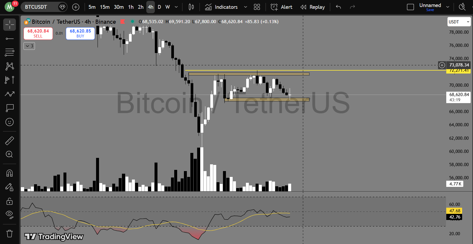 is currently consolidating after a strong bearish move. Price is ranging between a key resistance at 72,000–73,000 and a support zone at 67,500–68,000.