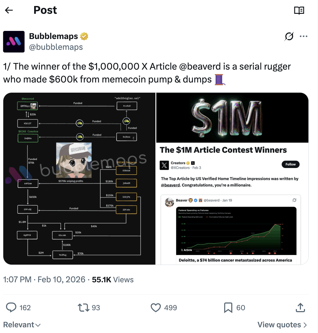 تخيل أن تفوز بجائزة قدرها مليون دولار من منصة X كمبدع عام، ثم تكتشف @Bubblemaps أنك كنت تسحب سيولة البسطاء عبر عملة $SIAS ومنصة Pump.fun خلف الكواليس