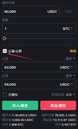 操作指引: 就像这张 $BTC 的截图一样,勾选 止盈/止损,然后直接输入你想止盈止损的价格。