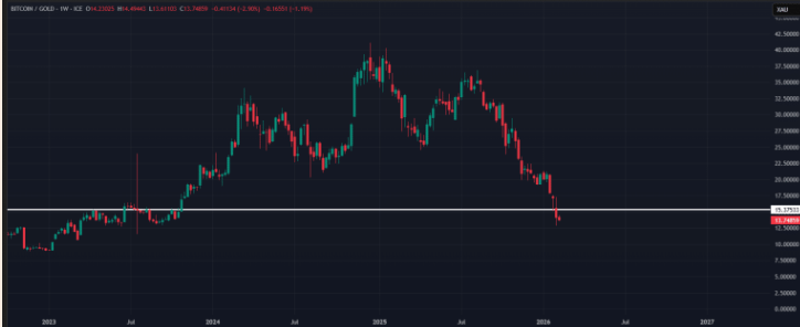 Watch the Bitcoin to Gold ratio. If it stays below 15.50, the bearish case gets stronger. The bottom may still be far away.