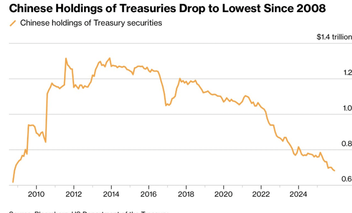 Now, the macro story. China is making a major move. Reports say they are instructing their banks to cut exposure to U.S. Treasuries. They've been selling aggressively. China's holdings of U.S. debt are now at an 18-year low.