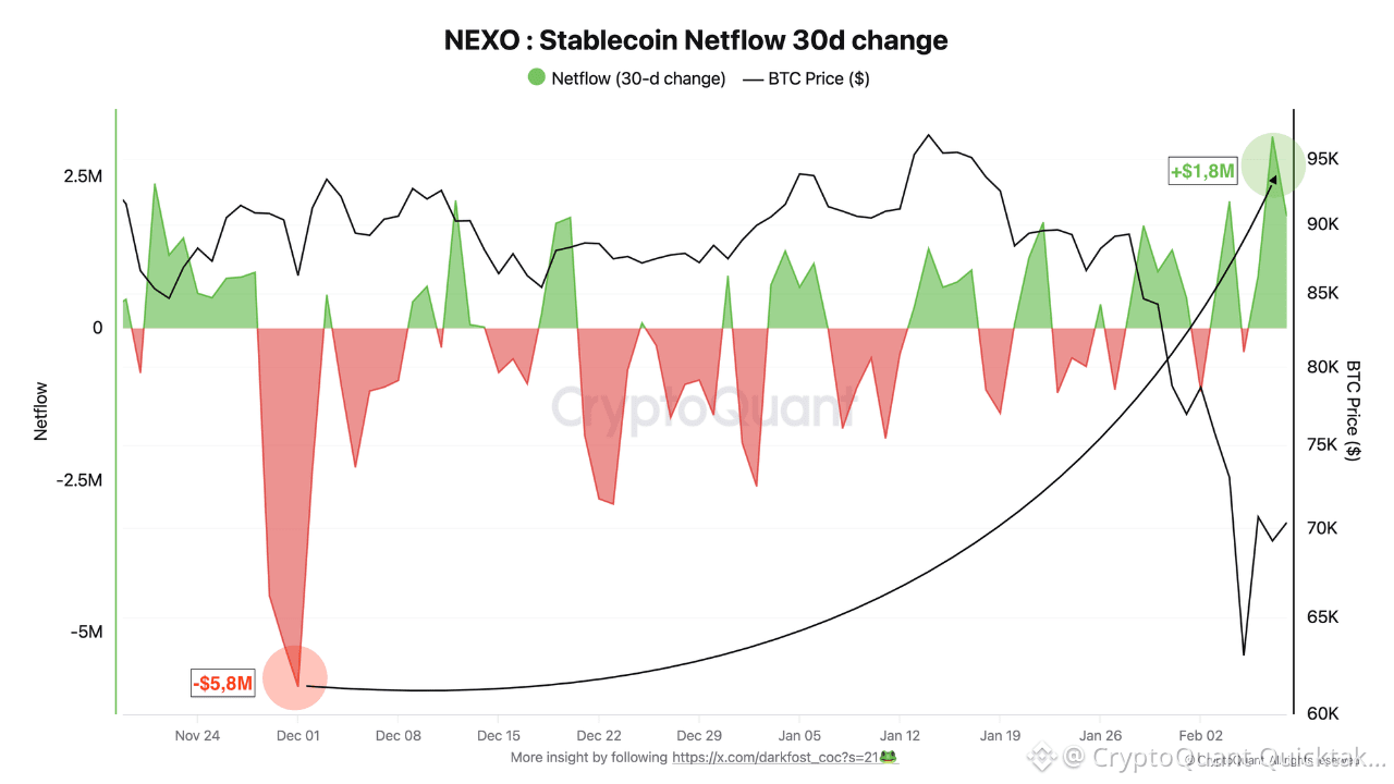 On December 1, average monthly stablecoin outflows stood at about -$5.8 million as Bitcoin’s correction was accelerating. As the downturn continued, flows reversed, and stablecoin netflows on Nexo turned positive, now reaching roughly $1.8 million.