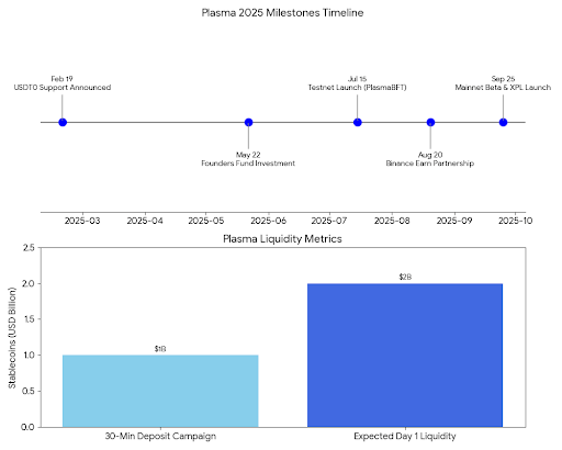 And then, in mid-September, Plasma published the mainnet beta plan: mainnet beta going live Thursday, September 25 at 8:00 AM ET alongside the launch of XPL, with $2B in stablecoins expected to be active from day one and capital deployed across 100+ DeFi partners. The post also mentions a deposit campaign that pulled in over $1B in stablecoin commitments in just over 30 minutes, plus details about bridging vault deposits to Plasma for USD₮0 withdrawals and enabling zero-fee USD₮ transfers through their dashboard. �