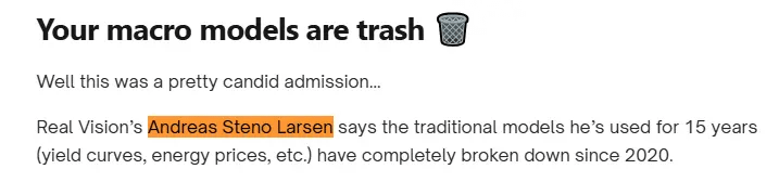 If you are trading based on the yield curve or energy prices, it may be time to reconsider your strategy. Indicators that were effective ten years ago have now broken down. Expert Andreas Steno Larsen recently acknowledged that the macro models he has been using for the past fifteen years have stopped working since 2020.