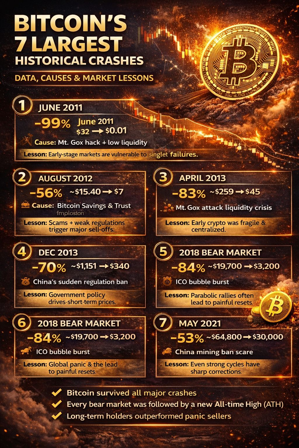 Let’s break down the 7 biggest BTC crashes and the lessons traders should never forget:
