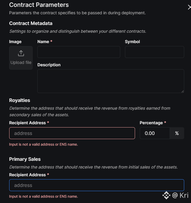 Fill in image, name, symbol & description for your ERC721 NFT Contract, Define Royalties, royalties recipient address and primary sale address.