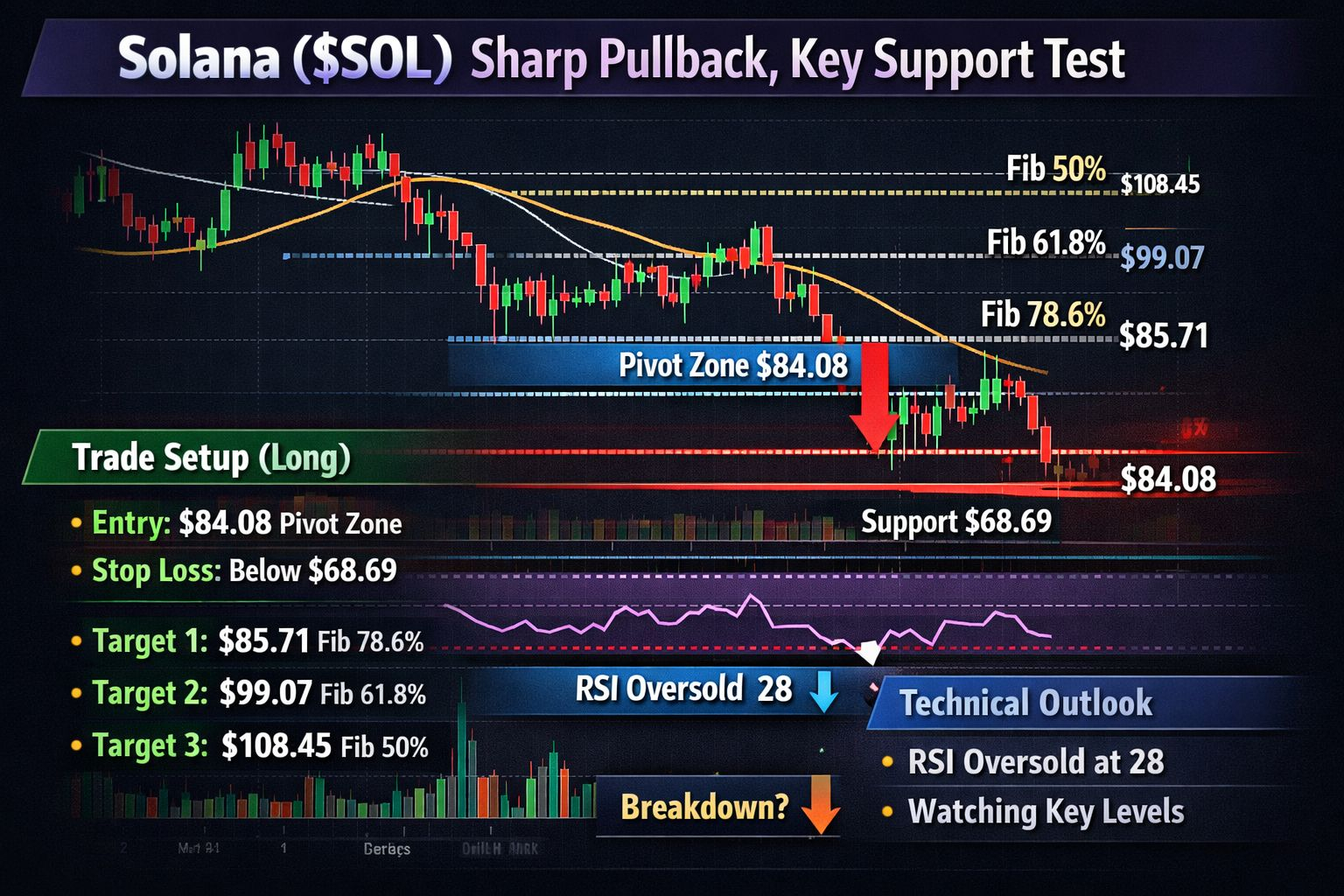 With RSI deeply oversold and price extended below key moving averages, a short-term bounce is possible. However, the dominant trend remains bearish unless $SOL reclaims higher Fibonacci resistance zones and establishes strength above them.