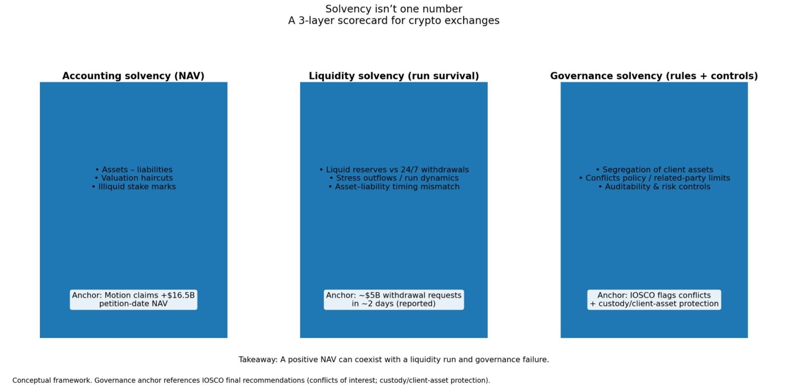 Liquidity solvency concerns whether crypto exchanges are structurally sound. Liabilities are on-demand, typically denominated in specific tokens, and confidence-sensitive.