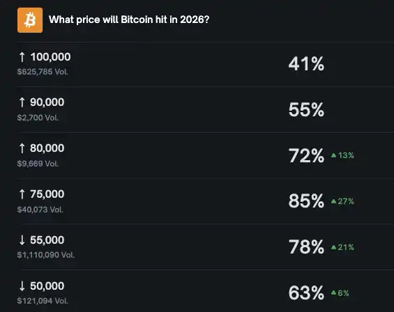 On February 11, a spectacle occurred on Polymarket: the same group of gamblers pushed the probability of "Bitcoin falling to $55,000 this year" up to 78%, while simultaneously buying the probability of "rising back to $80,000" at 72%. It’s like your friend just told you, "This project is going to fail," then turned around and asked, "Which coin should I go all in on?"—the market is not only mentally fractured but does so with a sense of justification.