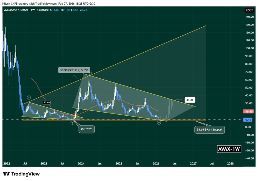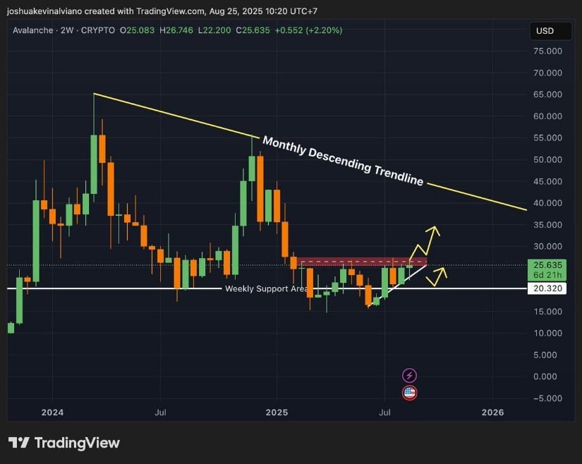 On the fundamental side, network activity has shown resilience. Growth in tokenized real-world assets on Avalanche expanded significantly throughout 2025, and usage metrics have seen periodic spikes. Technically, AVAX is rebounding from long-term support within a broader triangle formation, with some analysts speculating that sustained momentum could eventually open the door to higher macro targets.