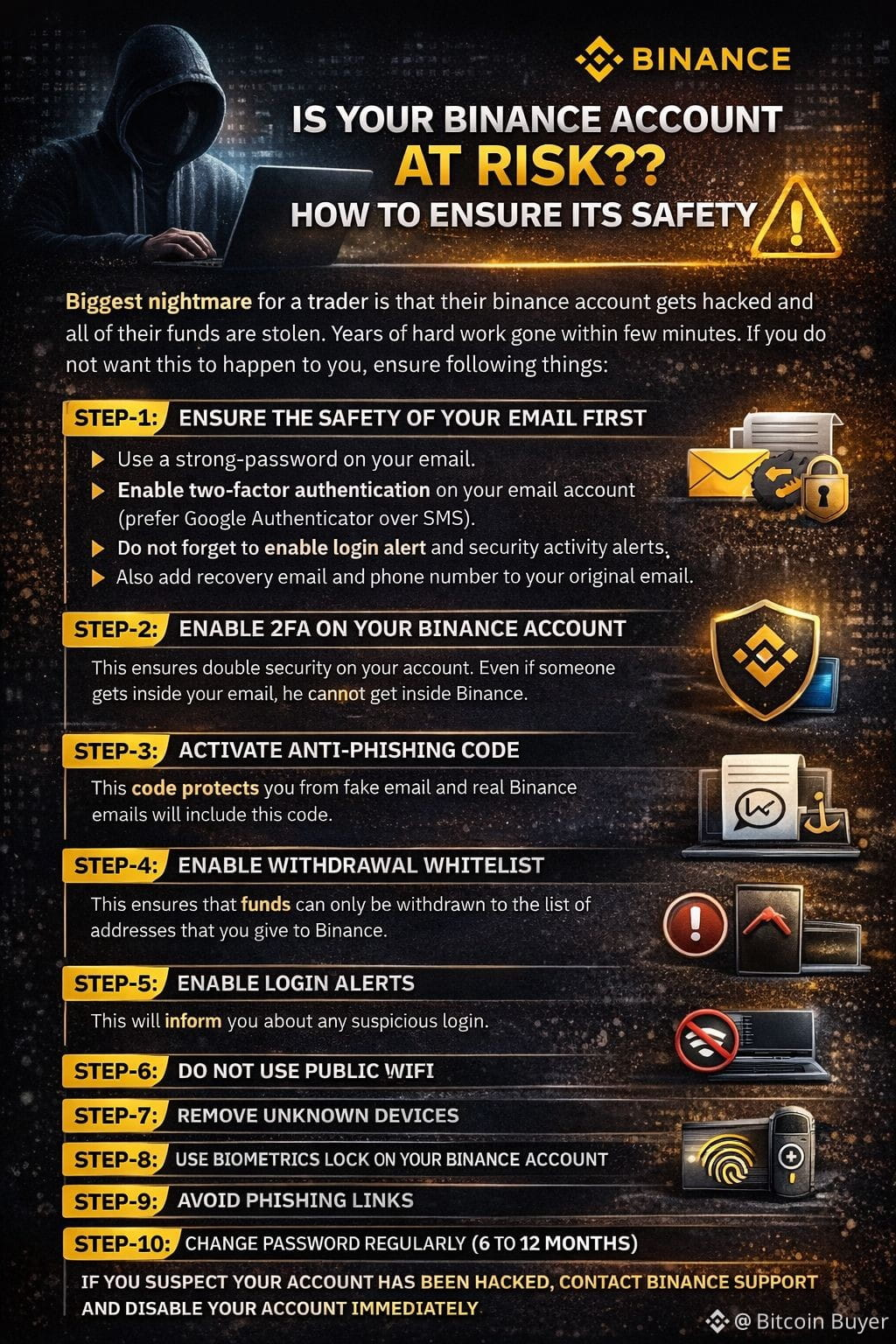 Biggest nightmare for a trader is that their binance account gets hacked and all of their funds are stolen. Years of hard work gone within few minutes. If you do not want this to happen to you, ensure following things: