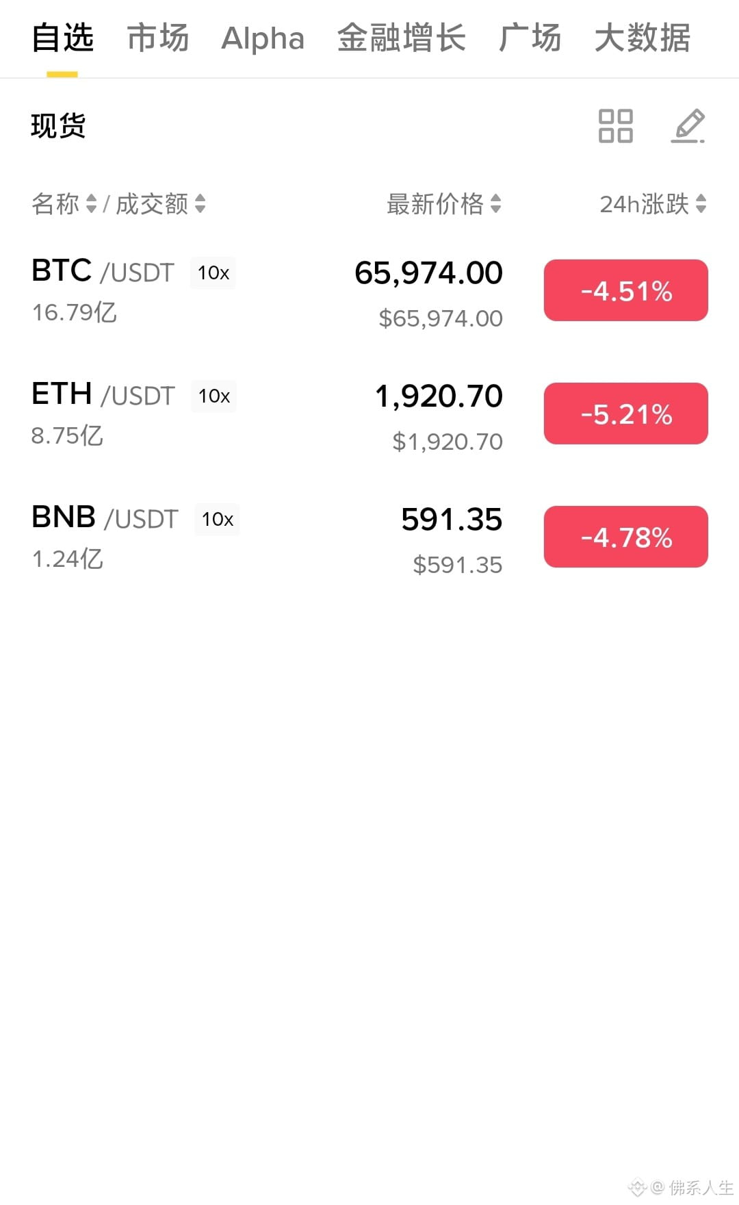 刚才看了一眼盘面,BTC/USDT直接跌到了65974美元,跌幅4.51%,ETH更是惨烈,跌破1920美元,跌幅5.21%,BNB也跟着跳水,跌了4.78%。看着满屏的红色,说实话,心里有点慌。