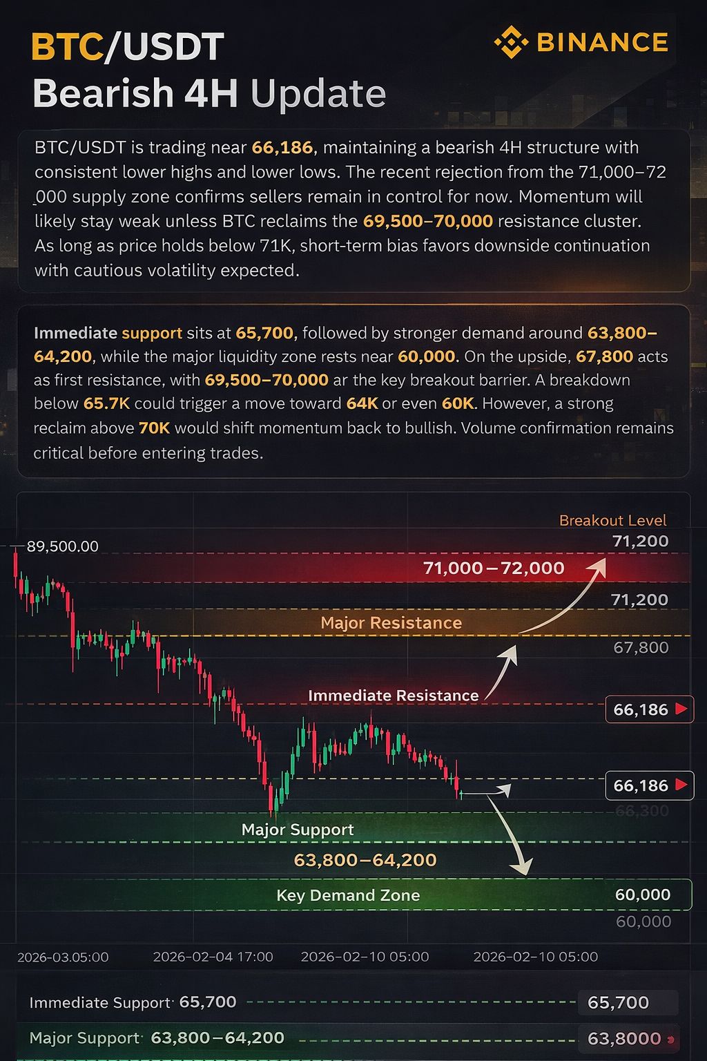 $BTC is currently trading around 66,186, showing clear bearish pressure on the 4H timeframe. Price is forming lower highs and lower lows after rejecting the 71,000–72,000 supply zone. Momentum remains weak unless BTC reclaims the 69,500–70,000 resistance cluster. As long as price stays below 71K, short-term structure favors sellers.