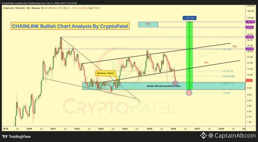 But Crypto Patel just dropped a very different take. He believes LINK is sitting inside a major long-term accumulation zone, and the next expansion could shock people who stopped paying attention. His chart points to a setup that looks bigger than a normal bounce.