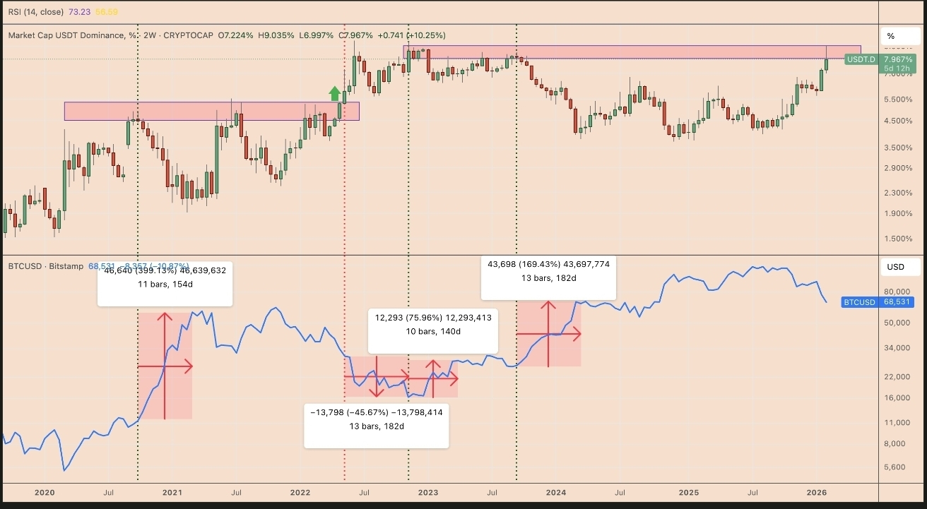 When USDT dominance pushed above that level in May 2022, Bitcoin dropped another 45%, highlighting their inverse relationship.