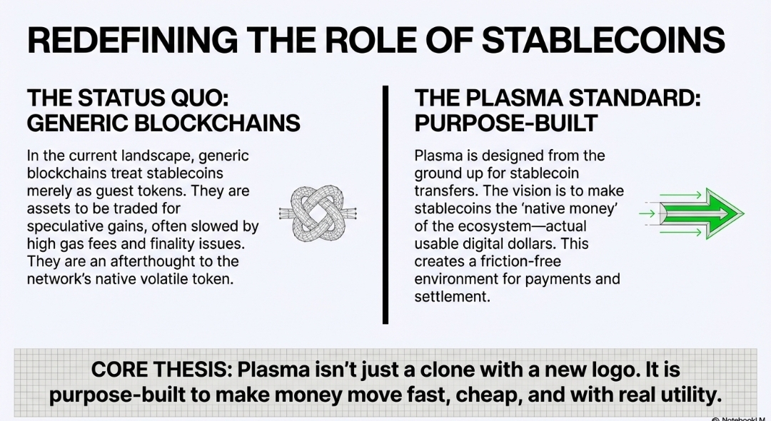 First things first: Plasma isn’t just another blockchain cloning Ethereum with a new logo. It was designed from the ground up to handle stablecoin transfers and to do them fast, cheap, and with utility that feels like real money. Unlike general blockchains that treat stablecoins as just another token, Plasma’s vision is that stablecoins become the native money of its ecosystem actual usable digital dollars, not just assets to trade for speculative gains.