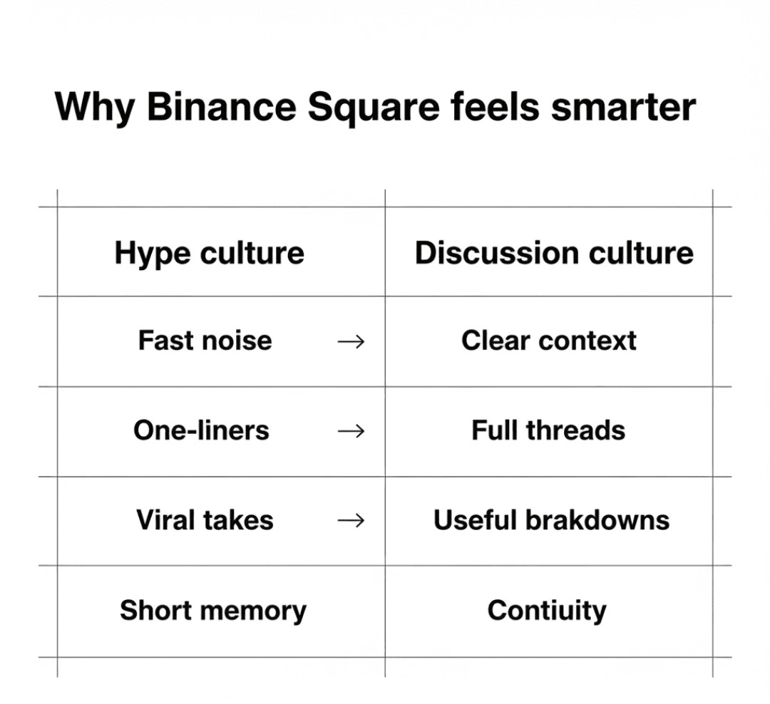 In other places, crypto discussion often turns into noise: people repeat the same lines, chase attention, and argue without adding any clarity. It’s loud, but it’s not helpful.