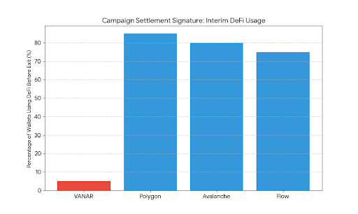 I searched for comparable patterns on Polygon, Avalanche, and Flow. They exist but with critical differences. On those chains, the consolidation wallets typically route through DeFi protocols before returning to exchange. The capital is being dual-purposed: used for settlement, then deployed for yield while awaiting the next campaign cycle. On VANAR, the consolidation wallets return to exchange within hours. No interim yield deployment. This is higher-cost behavior that only makes sense if the user values settlement finality above capital efficiency.