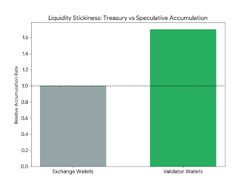 Current data shows validator controlled wallets accumulating at approximately 1.7x the rate of exchange controlled wallets. This is bullish. Validators have better information about actual network usage than any external analyst. They see the fee volumes, the transaction patterns, and the enterprise onboarding pipeline. Their willingness to stake additional capital rather than sell into the market signals confidence that the current trajectory is sustainable.