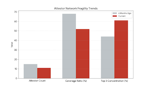 I flagged this concentration risk in my notes six months ago and have watched it worsen. In Q2 2025, the attestor set was fifteen entities. Three have dropped out, citing the operational overhead of maintaining compliance verification workflows. One was acquired and its attestation duties were absorbed by the parent entity. The trendline is moving toward consolidation, not diversification.