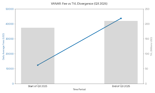I flagged the Q3 2025 on-chain data specifically. Average daily fees rose from $12,400 to $43,700 while TVL moved from $187M to $210M. The fee to TVL ratio increased by 270%. If you model VANAR as a general-purpose L1 competing for DeFi liquidity, this ratio signals death low capital efficiency means applications cannot subsidize user costs. If you model it as a specialized settlement layer for compliance verified transactions, this ratio signals exactly what you want to see: users paying meaningful fees for discrete settlement events rather than parking idle balances.