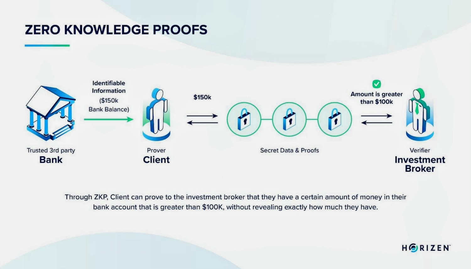 The verifier checks the proof: The network confirms the proof is valid without needing to see the private data.