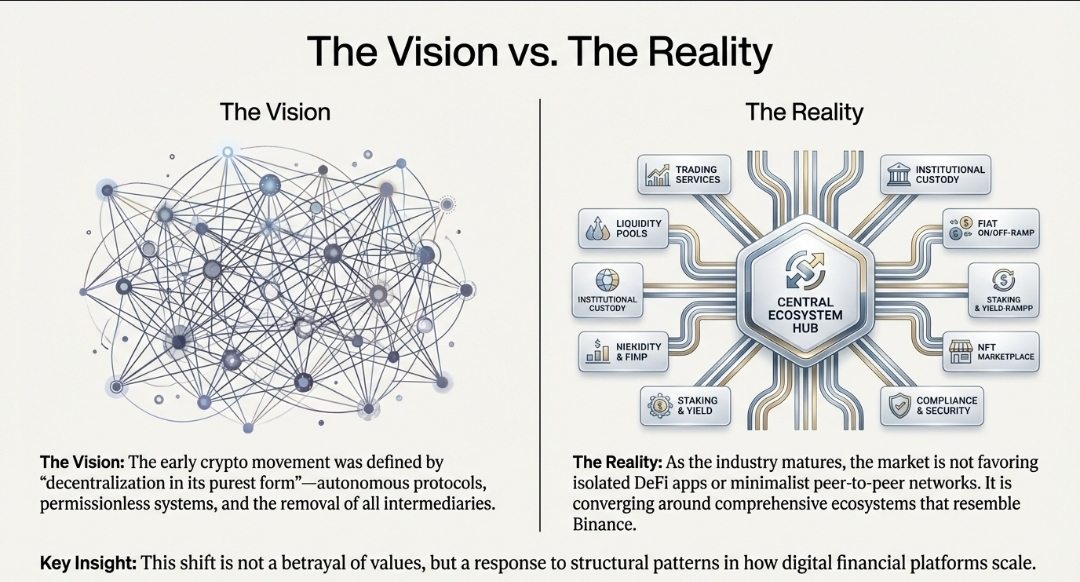 When people talk about the future of cryptocurrency, they often imagine decentralization in its purest form fully autonomous protocols, permissionless systems, and platforms that operate without centralized intermediaries. Yet, if we observe how the industry has evolved over the past decade, a different reality is emerging. The future of crypto platforms may not look like isolated DeFi apps or minimalist exchanges. Instead, it increasingly resembles comprehensive ecosystems more like Binance than many early crypto purists expected.