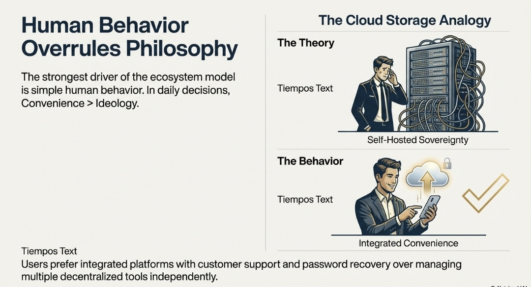 Behavioral economics research consistently demonstrates that convenience often outweighs ideological alignment in consumer decisions. Just as many people use centralized cloud storage instead of running personal servers, crypto users often choose integrated platforms over managing multiple decentralized tools independently.