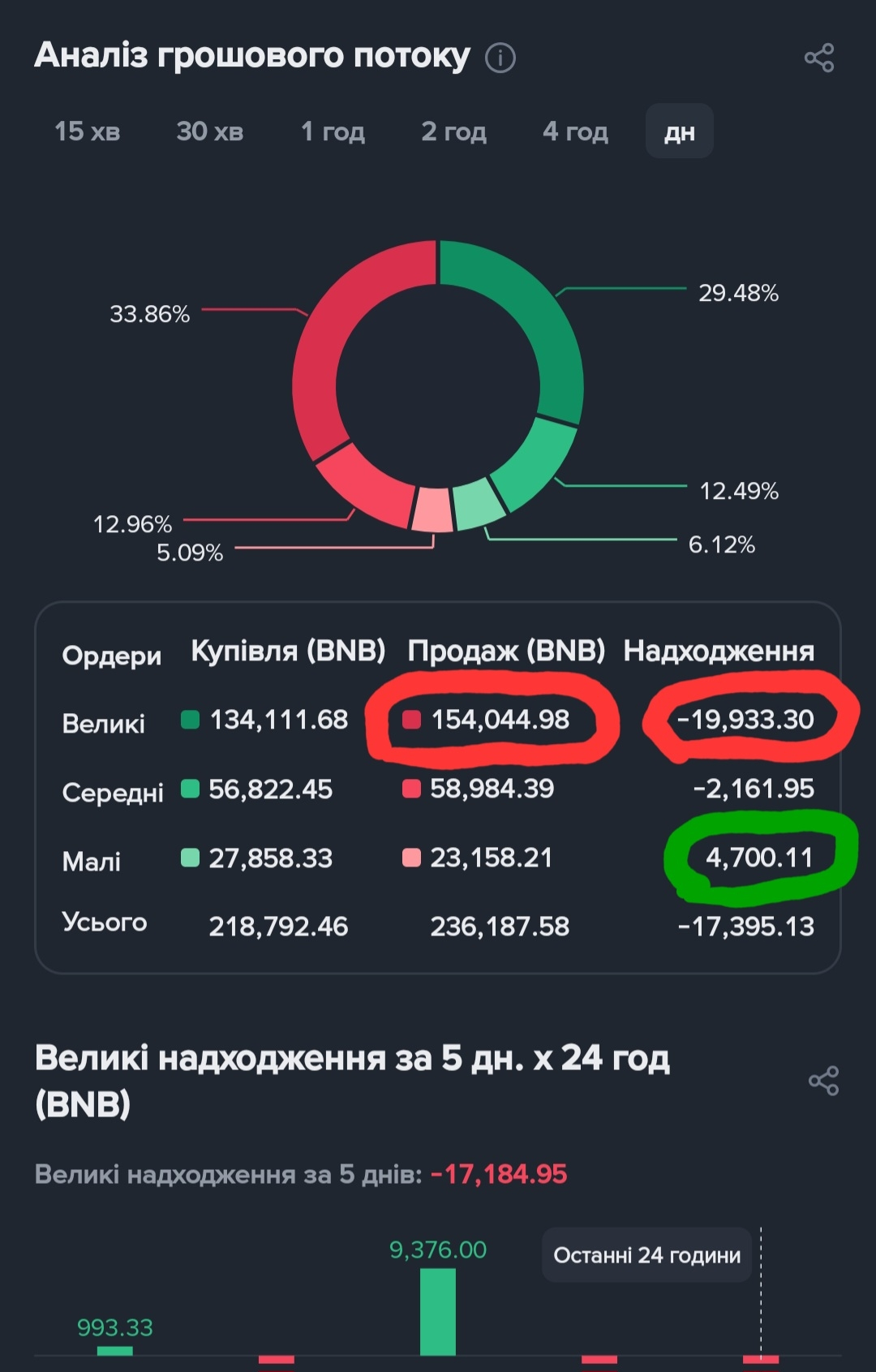 Total balance: The market lost -17,395 BNB in net inflow over the day.