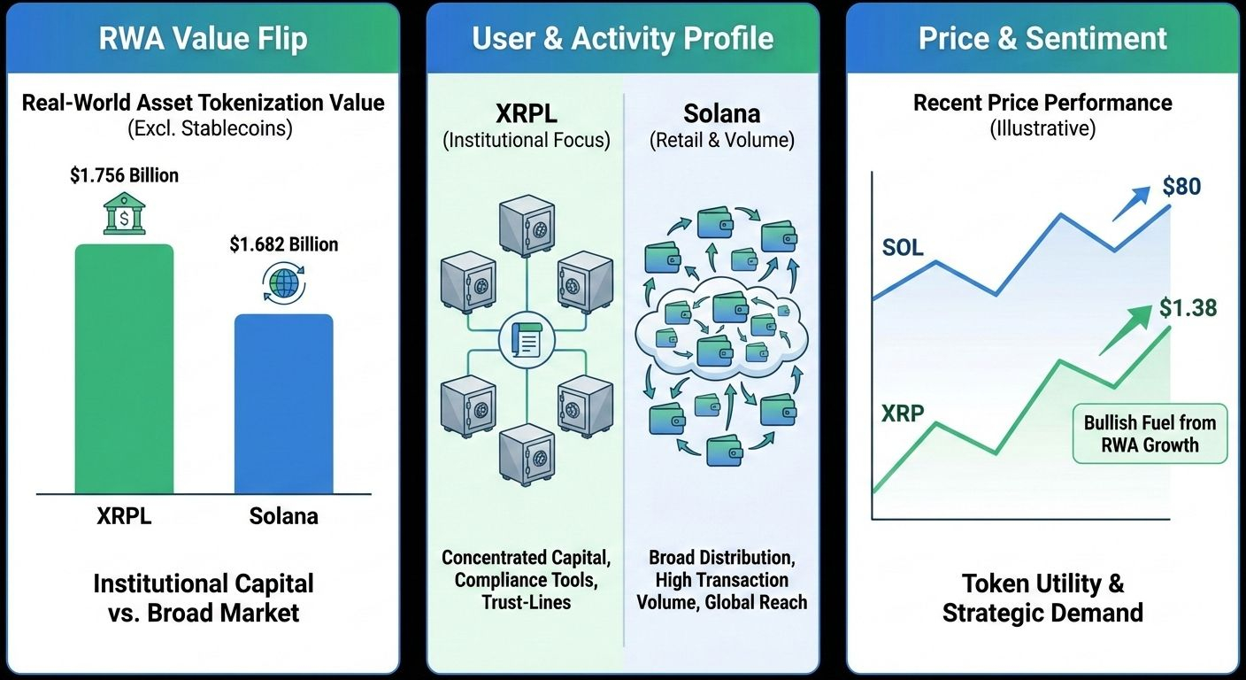 Forget the old narrative where speed and retail buzz defined blockchain winners. A new scoreboard has emerged and the $XRP Ledger (XRPL) is rewriting expectations. According to fresh onchain data, XRPL has surpassed Solana in real-world asset (RWA) tokenization value, hitting around $1.756 billion compared to $SOL $1.682 billion when excluding stablecoins. That’s a value flip that matters, and it’s driven by smart capital, not hype traders.