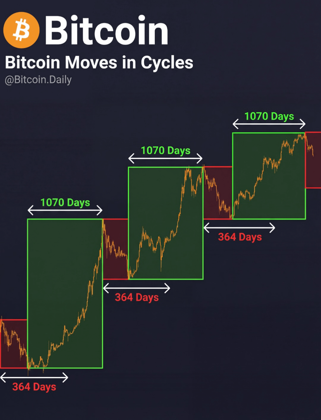 The chart doesn’t lie: → 2013–2017: 1,070 days up. 364 days down. → 2017–2021: 1,070 days up. 364 days down. → 2021–2025: 1,070 days up. And now?