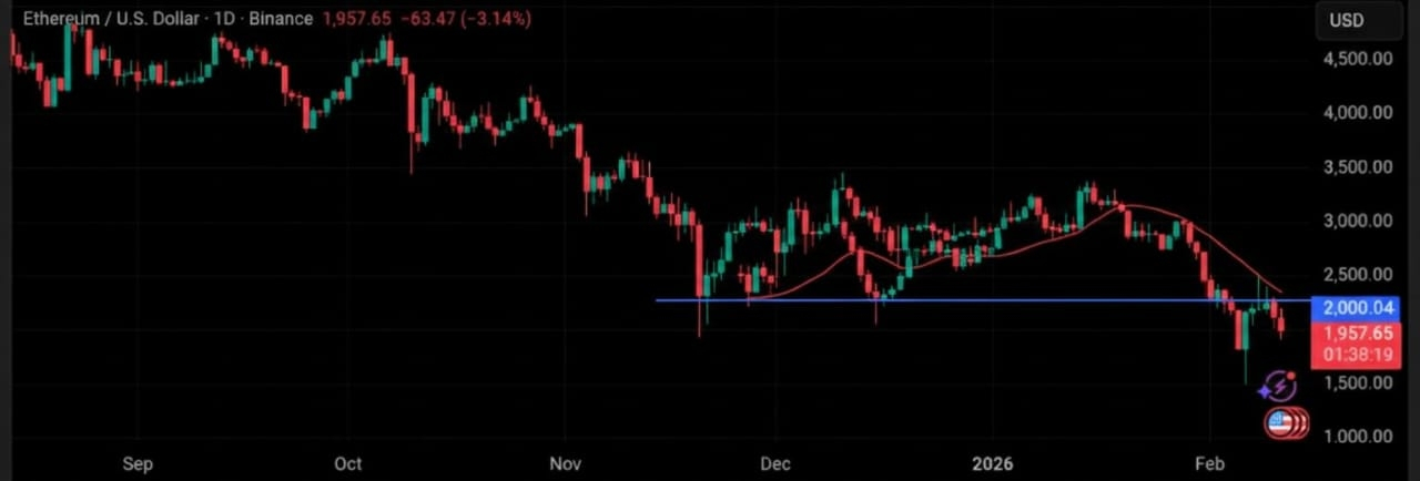 Ethereum is trading below the $2,000 level, and that alone tells you a lot about current market sentiment. Price has been sliding for weeks, and many people who bought higher are now sitting on losses. In fact, more than half of ETH holders are currently underwater.